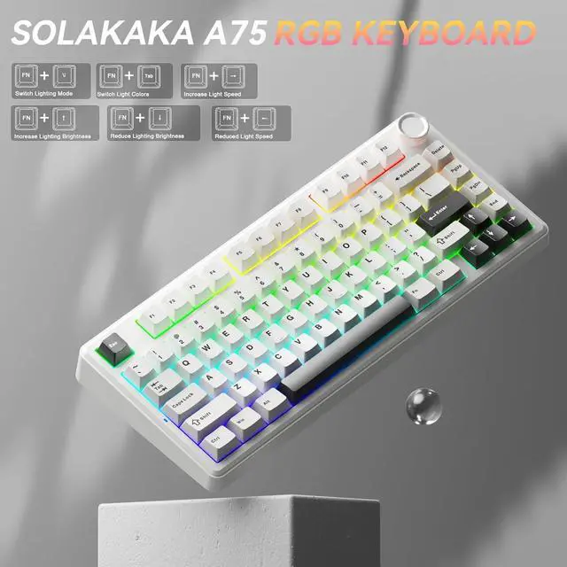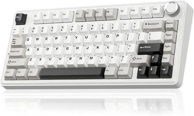 Compact Keyboard with Multifunctional Metal Knob: This 75 percent keyboard features a compact 81 keys while retaining essential gaming arrow keys. It saves valuable desk space and offers portability. And it equipped with a multifunctional rotary knob, it switches between gaming and office modes. In gaming mode, a short press selects lighting patterns, while rotating adjusts brightness. In office mode, a short press can mute or demute the device. Rotating the knob adjusts the volume