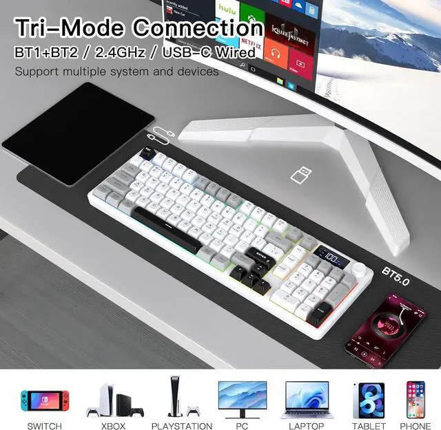 Multi-Device Connection: Advanced tri-mode connectivity supports BT 5.0, 2.4GH z wireless, and Type C wired modes. Connect up to 4 devices simultaneously and switch seamlessly to meet diverse needs for work, gaming, and learning.