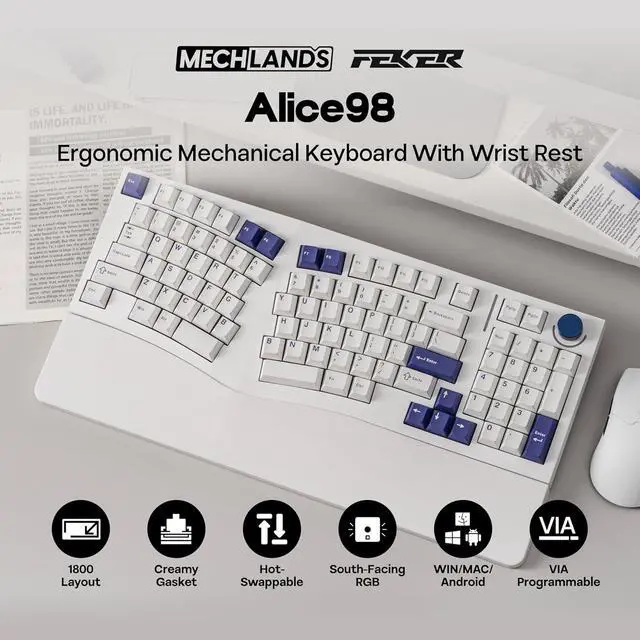 MechLands Feker Alice98 Ergonomic 98 Keys Custom Mechanical Keyboard, VIA Programmable, USB-C Wired Gaming Keyboard, Hot Swappable, 5 Layer Paddings, Control Knob, NKRO, RGB for Win/Mac (White)