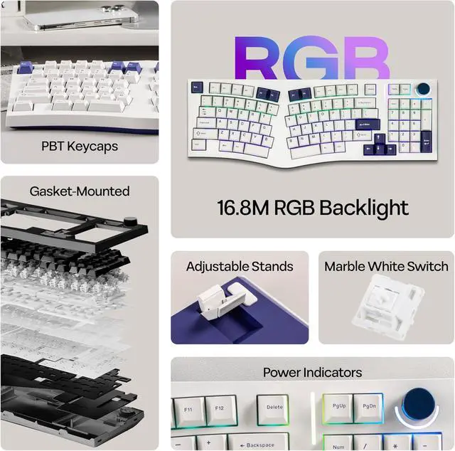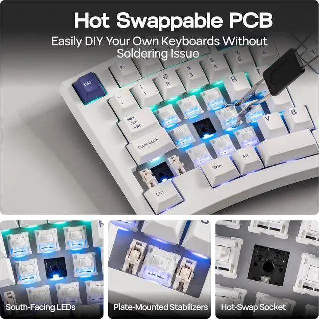 South-Facing RGB Backlight & Hotswappable PCB The Feker Alice98 keyboard is equipped with south-facing RGB LEDs, providing 21 customizable lighting effects that light up your desktop. The hotswappable PCB allows you to easily swap out switches without soldering, providing endless customization possibilities. The keyboard is also fitted with lubed plate-mounted stabilizers, making it easy to modify for a personalized typing experience. Additionally, the keyboard supports NKRO, ensuring that every keypress is registered, even during fast typing.