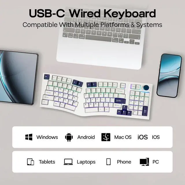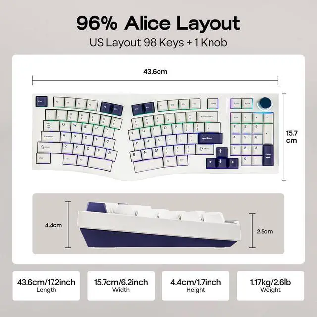 • Ergo Alice Layout with a Numpad The Feker Alice98 VIA Keyboard combines the beloved ergonomic Alice layout with the added functionality of a numpad, making it perfect for users who need both comfort and versatility. The Alice layout is designed with angled keys to align with the natural position of your hands, enhancing typing comfort. The split spacebar accommodates this ergonomic design, while a media control knob adds extra convenience. This layout allows your hands to rest naturally, reducing strain during extended typing sessions, all while maintaining the full functionality of a traditional keyboard.
