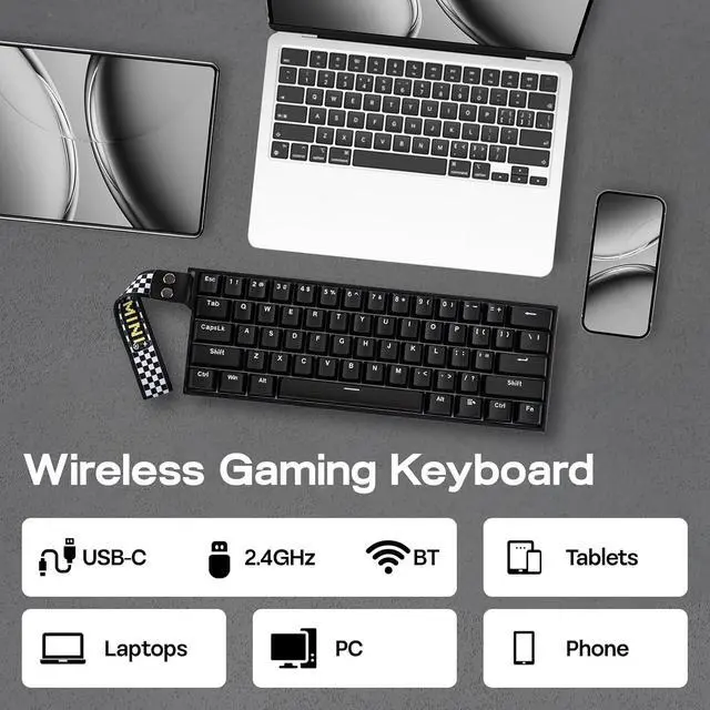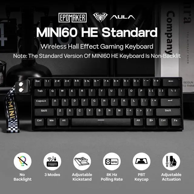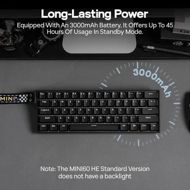 Long-Lasting Battery: Featuring a lab-tested PRO game level chip with low-consumption power-saving design, the MINI60HE wireless gaming keyboard performs reliably for 44 hours with the backlight off, without the frustrating mid-game pause due to low battery. Use FN+ESC to switch between single-key (ESC only) or full-board (any key) wake-up mode, to prevent accidentally waking up the MINI60 HE from sleep mode. (Note: The MINI60 HE Standard Keyboard does not come with a backlight feature, tailored for users who prefer a minimalist typing experience. )