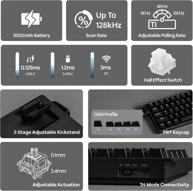 Polling Rate: Featuring 128K per-key scan rates and adjustable 8k Hz polling, the ultra-low latency MINI60 HE keyboard gives you the edge needed for fast-paced FPS games such as CS2 or Valorant, with unrivalled fast response wired and wirelessly. (Note: MINI60 HE Max features 8K polling in USB/ 2.4G hz mode, while MINI60 HE Standard only features 8K polling in wired mode).