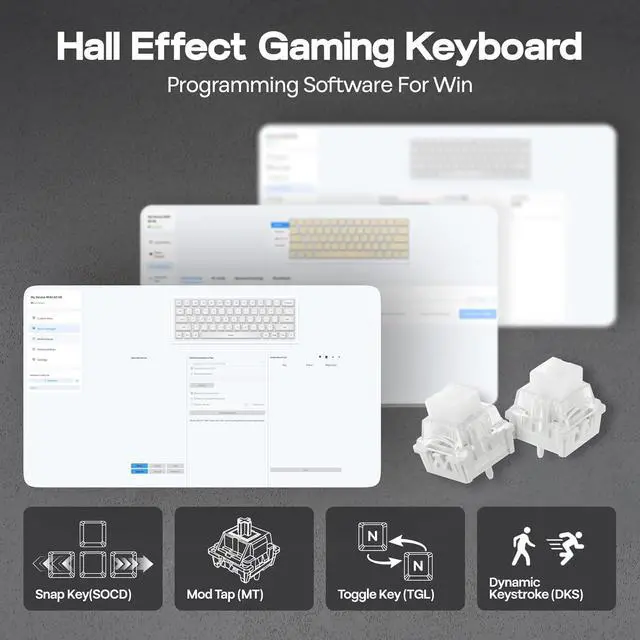 Snap Tap & Dynamic Keystroke: Snap Tap ensures lightning-fast directional changes in FPS or MOBA games by prioritizing the latest input between two keys. Dynamic Keystroke introduces true analog input, enabling up to 4 actions in a single stroke for seamless combos and macros.