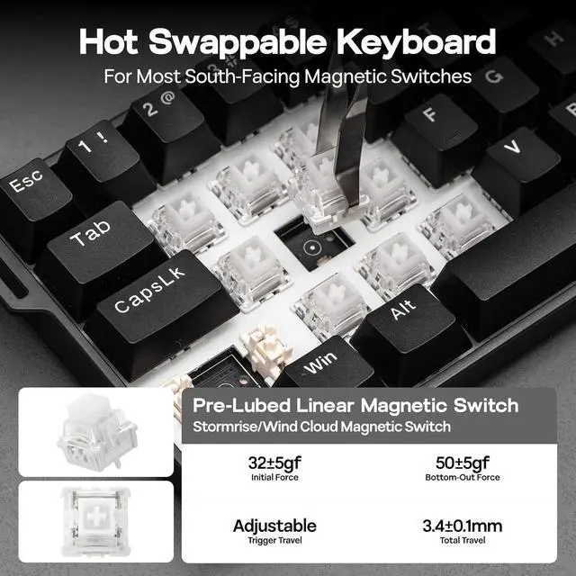 Adjustable Actuation Point: The MINI60HE features fully adjustable Hall magnetic switches, allowing you to customize each keys actuation point from 0.1 mm to 3.4 mm in 0.01 mm increments. Take full control of this hall effect gaming keyboard, with rapid keypresses or ultra-precise typing tailored to your needs.