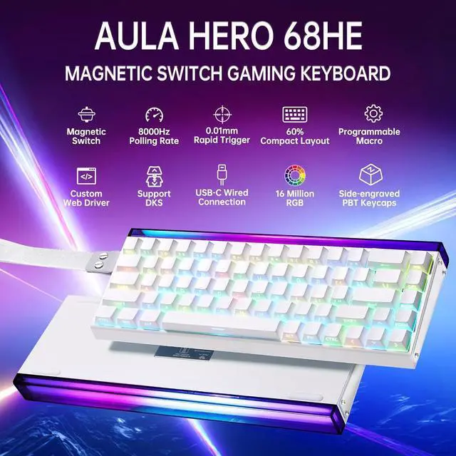 Professional Gaming Keyboards Hall Effect Switch & Ultra-fast Response: Equipped with hall effect switches, the AULA HERO 68HE gaming keyboard has an ultra-fast 8K polling rate and ultra-low latency of 0.125 ms to keep you ahead of the competition. Featuring premium construction and advanced magnetic switch technology, this hall effect keyboard ensures flexibility and superb response, perfect for FPS and other rhythm games.