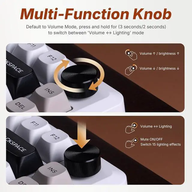 Multifunctional Knob: This wireless gaming keyboard has a convenient knob for switching operation modes. Press and hold it for 3 seconds to toggle between Lighting Mode and Volume Mode. In Lighting Mode, rotate to adjust backlight brightness and press to change effects. In Volume Mode, rotate to adjust volume and press to play/pause. Adjust settings instantly without interrupting work or gaming for a smooth experience.