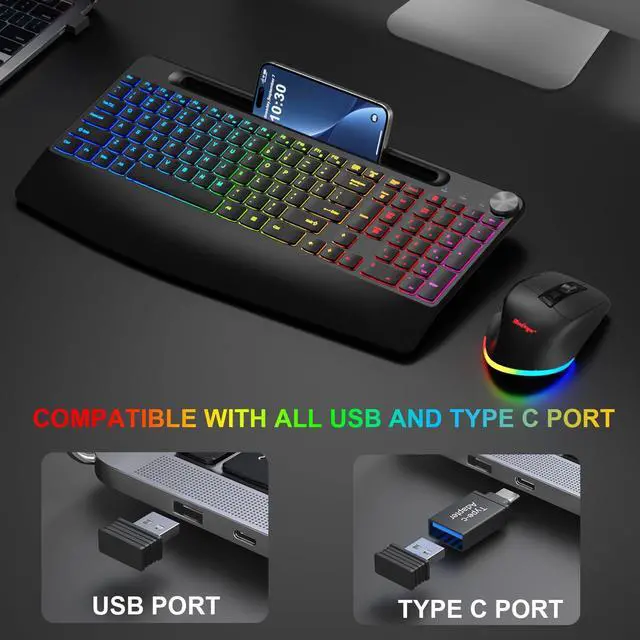 Dynamic RGB Backlit Combo: Wireless keyboard and mouse comes with 7 colors and 9 backlit effects, select from various lighting modes such as static, breathing, wave to match your style and mood, creating a visually stunning setup. RGB backlighting improves key visibility in low-light conditions, ensuring you can type with ease even in the dark. Perfectly balance work and games will be your best choice.