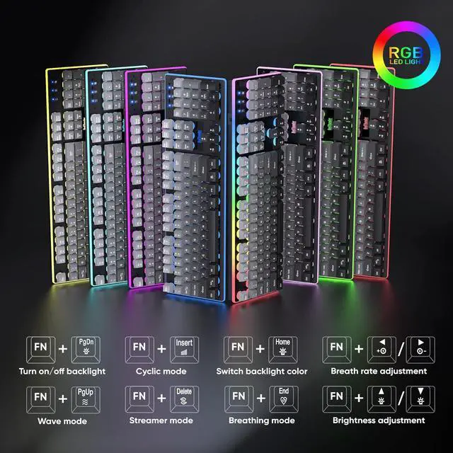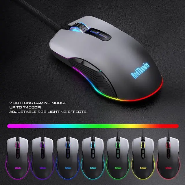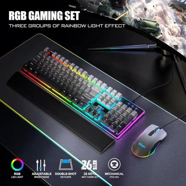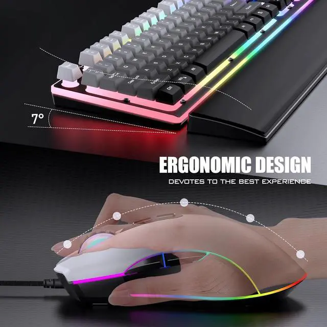 RGB Lighting Gaming ComboThe keyboard has 4 dynamic & 7 static color lights, illuminating its gaps, edges and logo; the mouse with 4 dynamic backlight modes (adjustable via top button) lights up its bottom edges and logo. Even in dim light, the gradient gray design creates a fun gaming atmosphere. (Note: Keyboard key characters do not light up)