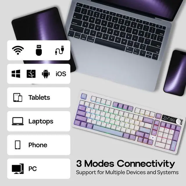 Triple Modes Connectivity The AJAZZ AK980 V2 wireless keyboard elevates your typing experience with its versatile triple-mode connectivity. Whether you' re at home, in the office, or on the go, seamlessly switch between BT, wireless, and wired connections. This flexibility ensures that you can stay productive and connected, no matter where you work from.