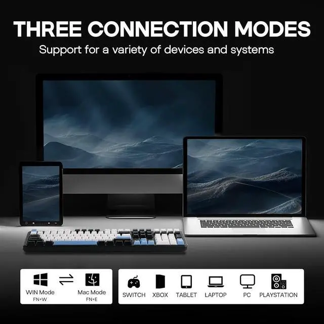 Wireless Keyboard with Limitless Compatibility: Packed with 4000mAh rechargeable batteries, double the power average gaming keyboard offers, F108 Wireless Keyboard grants up to 100 hours of continuous gameplay at peak performance with backlight off. Its versatile BT mode offers swift transaction from PC, Mac Laptop to Android Tablet, while the 2.4GH z wireless and USB Cable mode promise competitive-level stability and responsiveness with 1000Hz polling rate