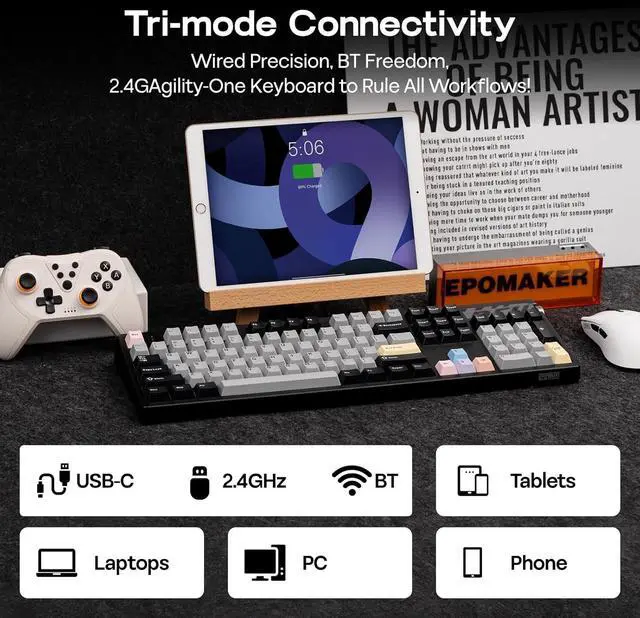 Long-Lasting Wireless Keyboard: Power passes the competition and ditches the charging cable with the outstanding 10000mAh battery of the TH108 PRO keyboard. Unlocking the realm of unfettered movement and sustained performance with this tri-mode wireless keyboard, without frustrating cable drag hindering swift mouse movements, for seamless transition between up to 5 paired devices under cable, 2.4G hz and BT modes. PC, Mac laptop, or Android tablet, whichever devices you game on, the 200-hour wire-free battery life makes inconvenient mid-game recharge a worry in the past.