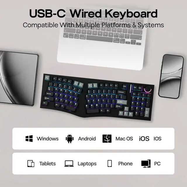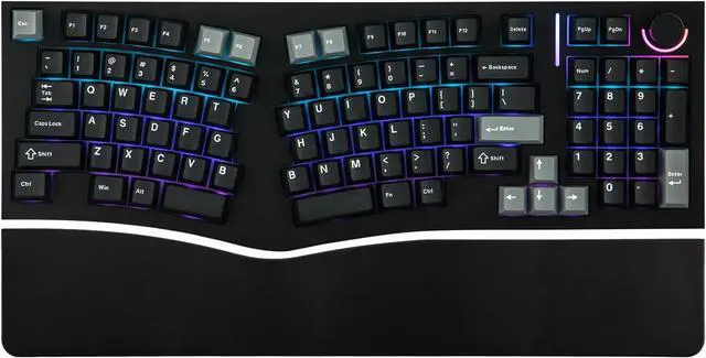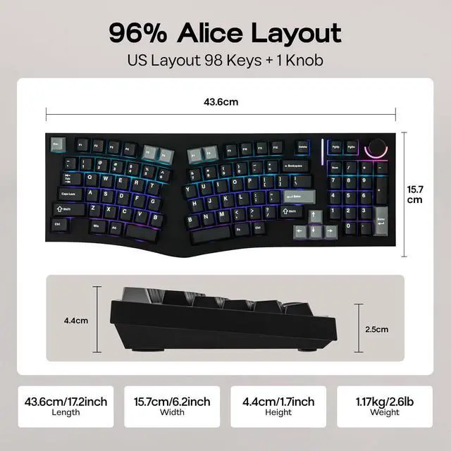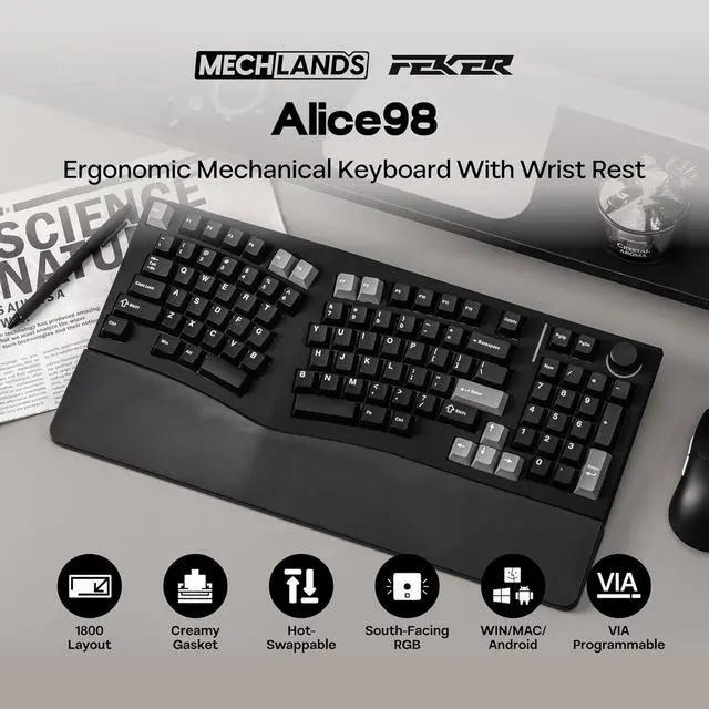 Ergo Alice Layout with a Numpad The Feker Alice98 VIA Keyboard combines the beloved ergonomic Alice layout with the added functionality of a numpad, making it perfect for users who need both comfort and versatility. The Alice layout is designed with angled keys to align with the natural position of your hands, enhancing typing comfort. The split spacebar accommodates this ergonomic design, while a media control knob adds extra convenience. This layout allows your hands to rest naturally, reducing strain during extended typing sessions, all while maintaining the full functionality of a traditional keyboard.
