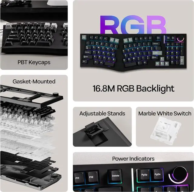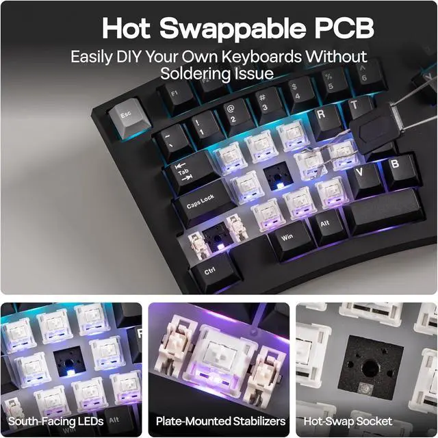 South-Facing RGB Backlight & Hotswappable PCB The Feker Alice98 keyboard is equipped with south-facing RGB LEDs, providing 21 customizable lighting effects that light up your desktop. The hotswappable PCB allows you to easily swap out switches without soldering, providing endless customization possibilities. The keyboard is also fitted with lubed plate-mounted stabilizers, making it easy to modify for a personalized typing experience. Additionally, the keyboard supports NKRO, ensuring that every keypress is registered, even during fast typing.