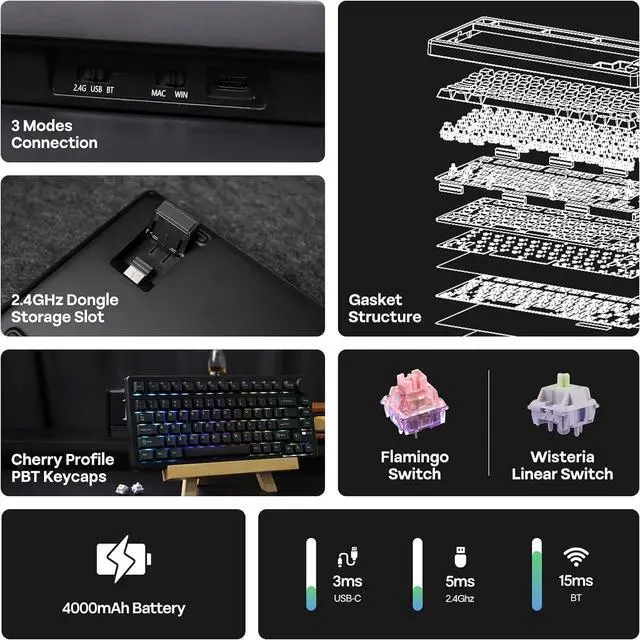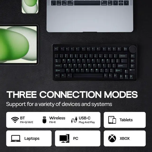 260 Hours Long-Lasting Wireless Keyboard: Unleash yourself from cable clutter and power anxiety with the QK81 wireless keyboard. Conquering the virtual worlds for weeks on a single charge. Boasting an incredible 4000mAh battery, this powerhouse delivers an astounding 260 hours of uninterrupted use with the vibrant backlight off, for a clean, minimalist desk setup, unburdened by tangled wires, offering complete freedom of movement for your mouse and peripherals. Cable wired, 2.4G hz or BT wireless, easily switch between 3 connection modes with the toggle besides USB port, for stable performance on PC, Mac laptop, Android tablet, phones or gaming controllers