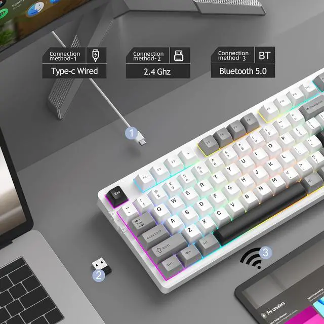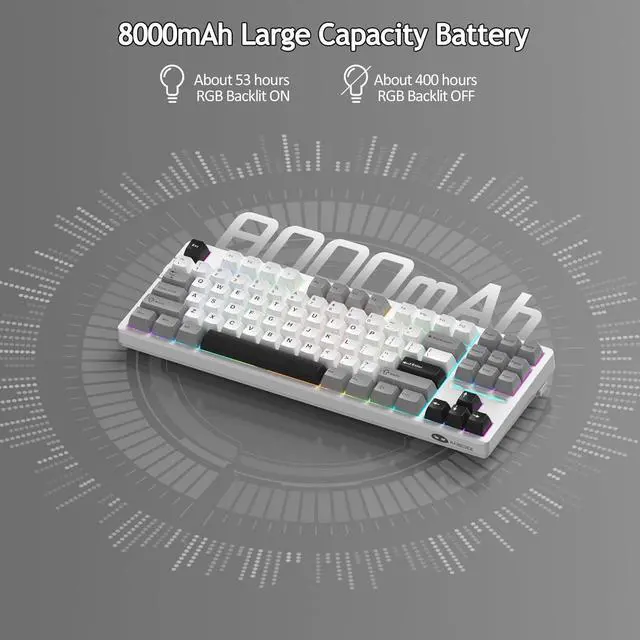 [8000mAh LARGE BATTERY and PBT KEYCAPS]: The 75% layout mechanical keyboard saves more desktop space while retaining function keys and arrow keys for games and work. all 87 keys 100% anti-ghosting, unique side printed durable PBT keycaps, also equipped with a 8000mAh large-capacity battery, support win/mac dual system.