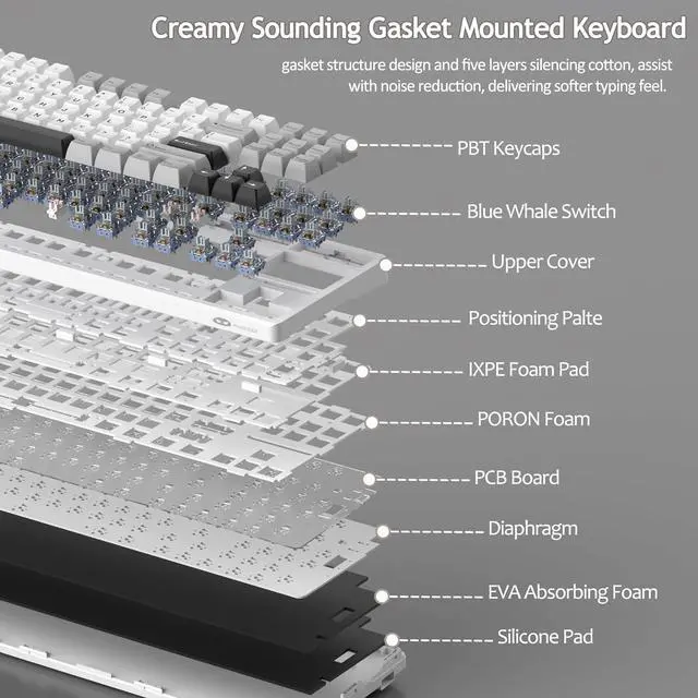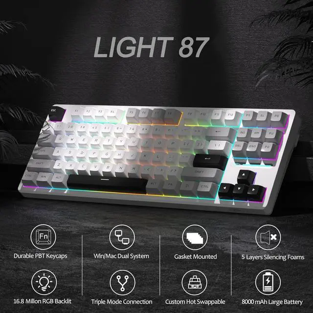 [CREAMY THOCK SOUND GASKET STRUCTURE]: LIGHT87 keyboard mounting is different from the traditional screw fixing method, but using gaskets mounted on the top and bottom sides between the panel and the keyboard shell, which acts as a cushioning layer, in addition, the keyboard is designed with five layers sound-absorbing foams filling, can effectively reduces the noise, improves the typing comfort and accuracy, and brings crisp, clean and softer typing feel.
