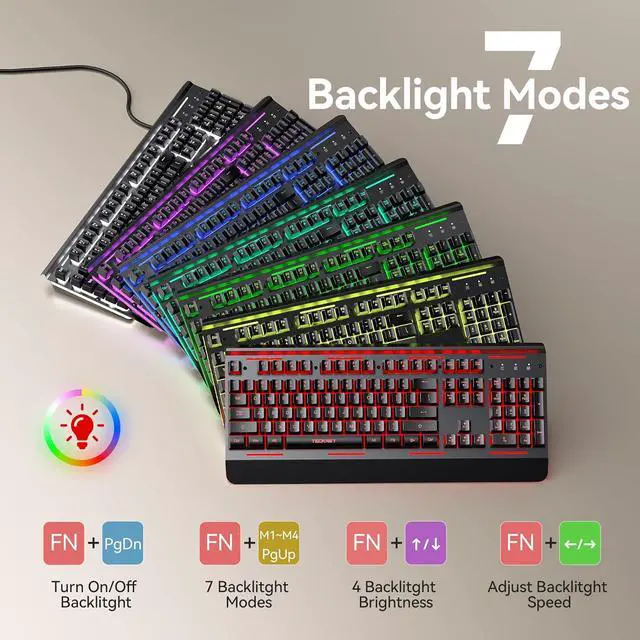 7 Rainbow Backlights KeyboardThe Wired keyboard has 7 backlight modes, 7 colors and 4 brightness levels to choose from to suit your preferences. Whether it' s late-night work or immersive gaming, our keyboards enhance every experience!