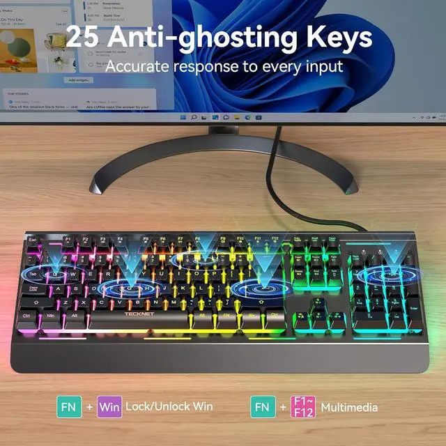 25 Anti-Ghosting Keys & 12 Multimedia KeysWith 25 anti-ghosting keys, you can press multiple keys simultaneously for instant gaming response. Additionally, 12 multimedia keys offer easy control over functions like calculator, music, and volume adjustment. Ideal for gaming and office tasks, this PC keyboard enhances your efficiency and productivity significantly.