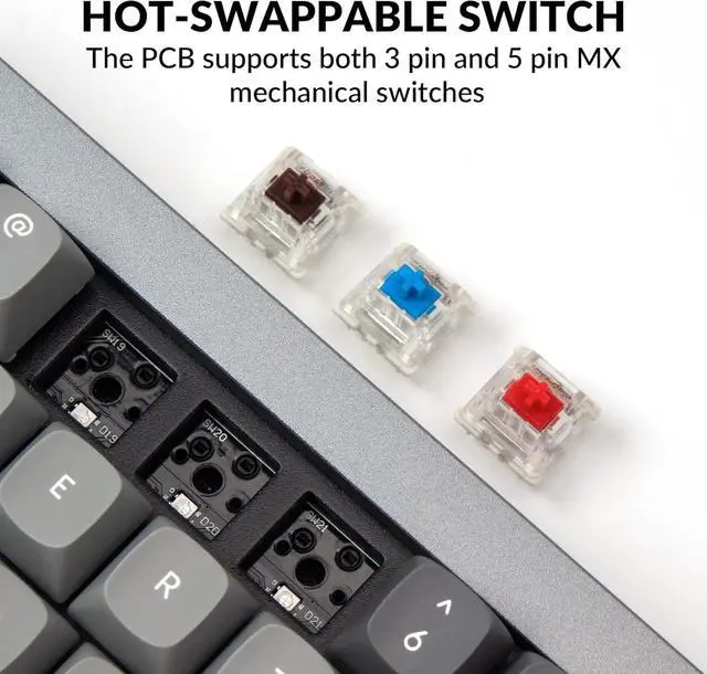 Hot-swappable: The Q7 features a fully hot-swappable design that supports both 3pin and 5pin MX-style switches (like Cherry, Gateron, Kailh) without soldering, and it comes pre-installed with factory-lubed Gateron G Pro Red switches for a smooth linear feel and a lifespan of up to 50 million keystrokes.