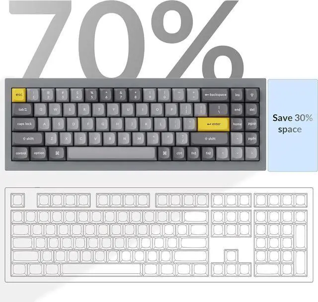 Saving Space: The Keychron Q7 features a 70% layout that retains all essential function keys while significantly reducing its footprint. This design frees up valuable desk space for mouse movement and a cleaner setup, making it ideal for compact workspaces or users pursuing a minimalist desktop.