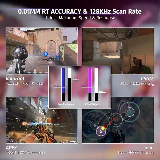 0.125 ms Latency, 8000Hz Polling RateThe X68 HE is the Magnetic keyboard with both 8000Hz polling and 128KHz scan rates. Its latency is drastically lower than most 8000Hz magnetic switch keyboards, offering a game-changing 8x faster response than conventional gaming keyboards.