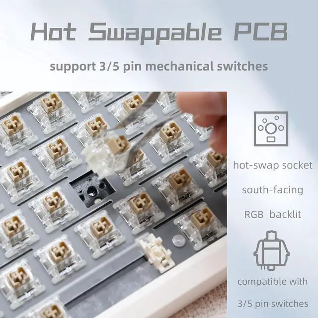 HOTSWAP GASKET KEYBOARD This TKL mechanical keyboard is equipped with a hotswap socket and a gasket structure plate, supporting most of 3pin/5pin switches on the market, so that you can replace the switches as you like.