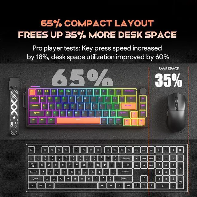 68% Compact Layout with Gasket Mount This space-saving 68% keyboard retains arrow and navigation keys for efficiency. Its gasket mount structure and multi-layer sound-dampening foam are designed to minimize typing vibration and noise for a consistent and premium typing experience.