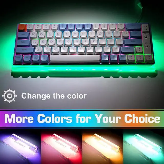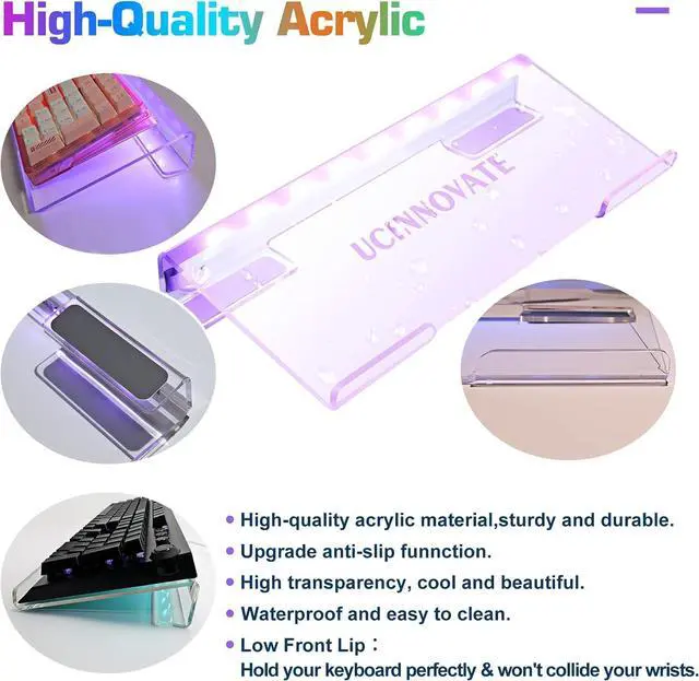 RGB Acrylic keyboard Holder This RGB Acrylic keyboard stand made by high quality 4mm clear acrylic. Smooth and rounded edges and polished finishes. USB interface, 3 keys mini controller. You can switch to the previous or next lighting mode at will. Whether you are playing games or working at night, it will give you a cool experience, the backlight can be turned off freely.