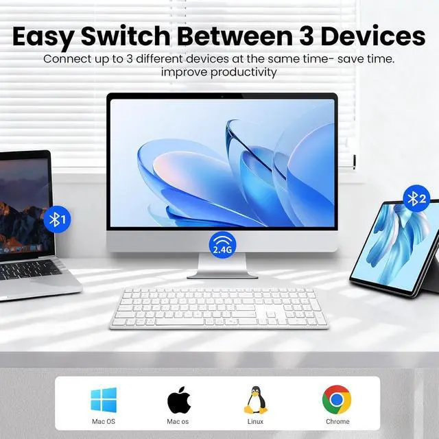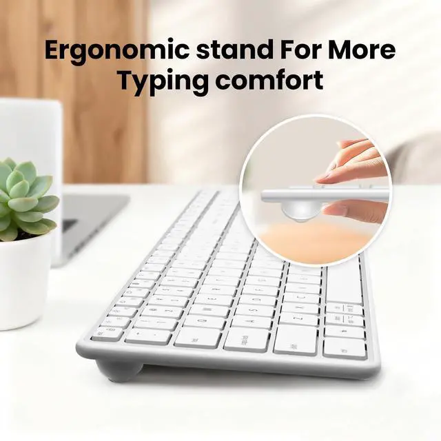 FULL-SIZE BLUETOOTH KEYBOARD: The wireless keyboard is in full size design with QWERTY US Layout. The ultra-thin keyboard has an independent number zone and multimedia functions. quiet typing on a familiar wireless keyboard layout, making your work more efficient