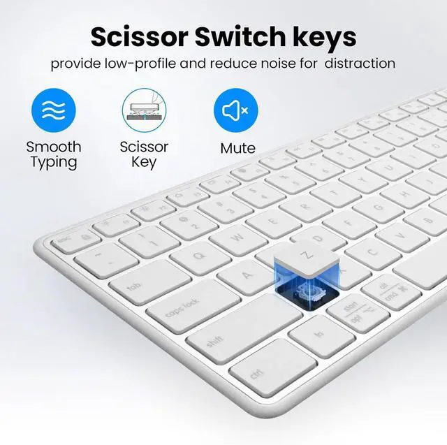 SCISSOR KEY DESIGN: The computer keyboard adopts scissor mechanism, easy-access keys like mute, volume, and play. The X-structure design of the keys is labor-saving, light-sounding, stable, and can accurately supplement every stroke. Noiseless click technology allow you to do your job, no worry about disturbing your family when typing or clicking