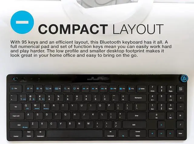 COMPACT LAYOUT With 95 keys and an efficient layout, this Bluetooth keyboard has it all. A full numerical pad and set of function keys mean you can easily work hard and play harder. The low profile and smaller desktop footprint makes it look great in your home office and easy to bring on the go.