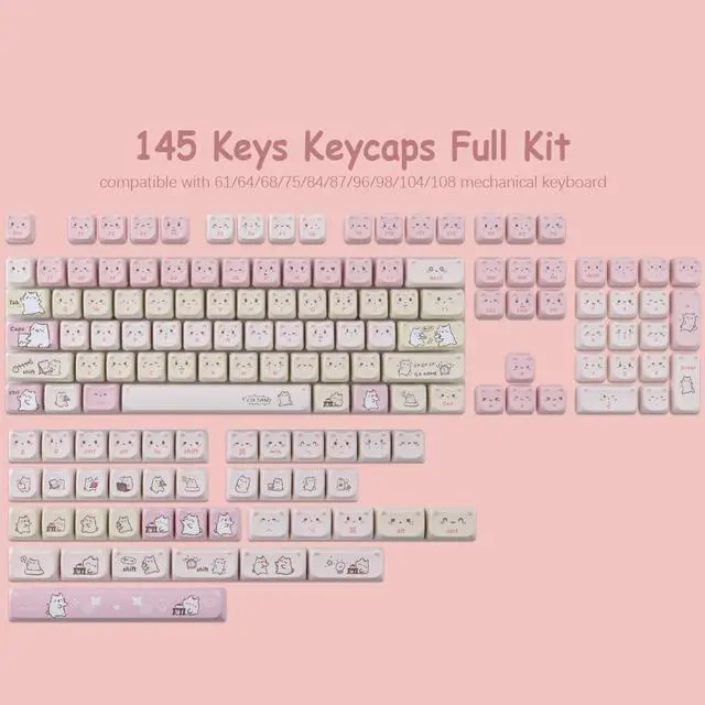 Thick PBT KeycapsThese 145 keys cute lazy cat keycaps are made of PBT material, with a matte texture and anti-grease coating, thick and durable, fine workmanship, and not easy to get dirty