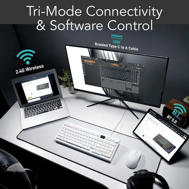 TRI-MODE WIRELESS CONNECTIVITY: Connect seamlessly using 2.4GH z wireless, Bluetooth 5.0, or USB-C wired mode. The Spectre tri mode mechanical keyboard delivers ultra-stable, lag-free performance with up to 400 hours of battery life from its 4000mAh rechargeable battery. Perfect for gaming PCs, laptops, or office setups needing reliable wireless mechanical keyboard connectivity with instant switching between devices.
