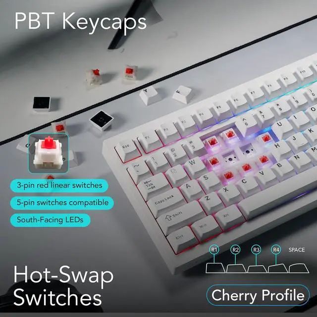 SOUTH-FACING 5-PIN HOT-SWAPPABLE SOCKETS: Customize your mechanical keyboard setup effortlessly with south-facing RGB LEDs and universal 3-pin or 5-pin MX-compatible sockets. The pre-lubed Candy Red linear switches deliver fast actuation and consistent response ideal for competitive gaming or precise typing. Compatible with most aftermarket keycaps and switches, this hot swappable keyboard supports full RGB lighting optimization.