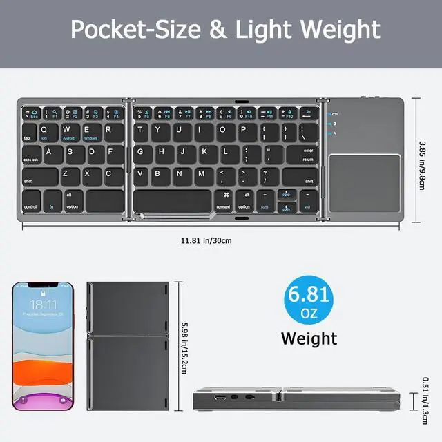 Foldable Bluetooth KeyboardThe foldable bluetooth keyboard can be folded into pocket size and carried around easily in your backpack. Stable bluetooth connection with max working distance of 10 meters. You can use it anywhere when you need to finish some type work on your phone or tablet.