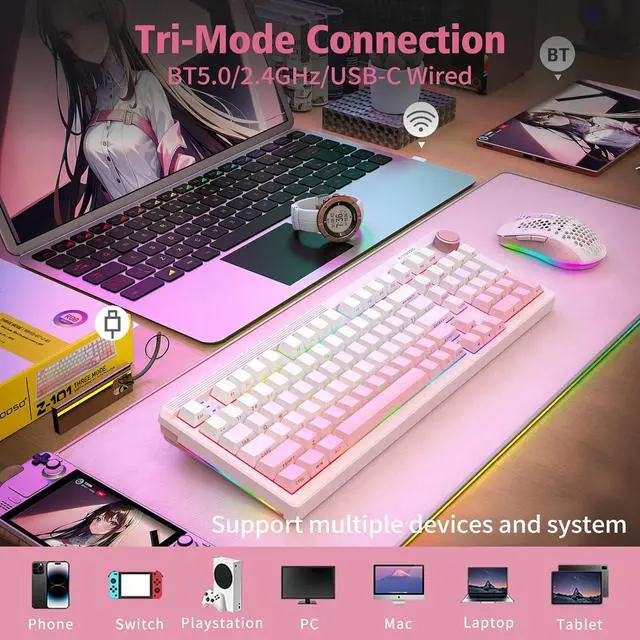 Tri-mode Connection KeyboardThe wireless mechanical keyboard provides three connection methods, including Bluetooth 5.0, 2.4GH z wireless mode, and USB wired mode. It can be connected to up to five devices at the same time, and switch between them easily by FN+ combination keys. No limits about your keyboard connection to meet the needs of work, gaming, and study.