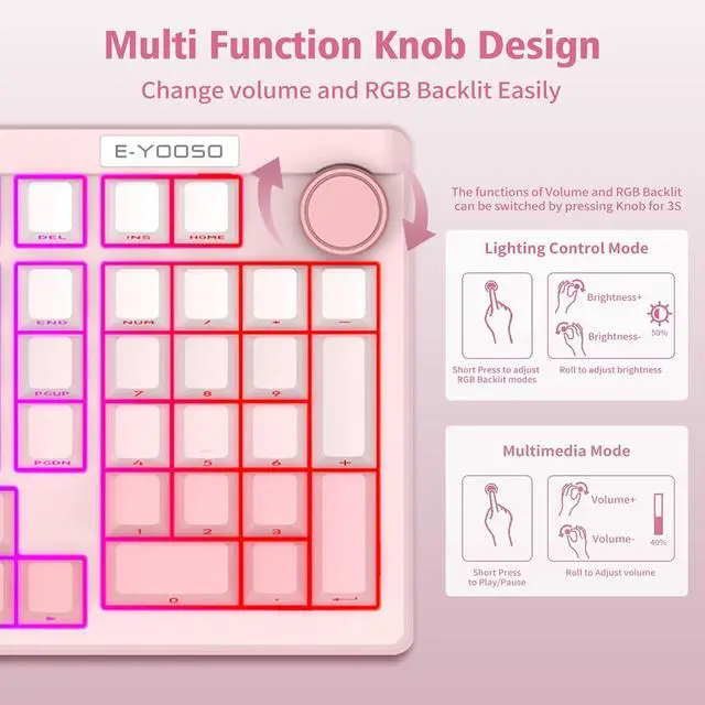 Multi-Function KnobThe bluetooth keyboard with number pad has a knob, and it can adjust not only the volume, but also the lights. rotate to adjust volume; Short press to mute/unmute. Switch to