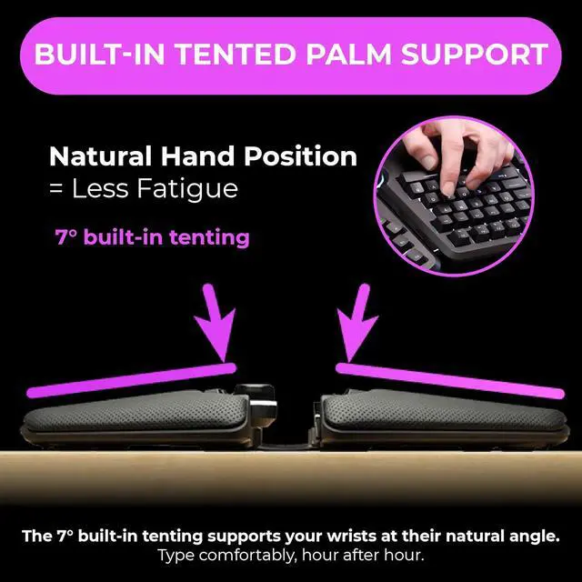 Tented Palm Support Includes built in side slope (7 degrees) keeping hands comfortable at their natural inward angle (no separate tenting kit required).