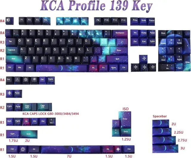Custom keycapsKeycap set full 139 keys, including 104 standard keys and 35 modifier keys, suitable for most ANSI/ISO layout cherry mx switch 61/68/84/98/104/108 mechanical keyboard. Keycap spacebar is 2u/ 2.25 u/ 2.75 u/3u/ 6.25 u/7u