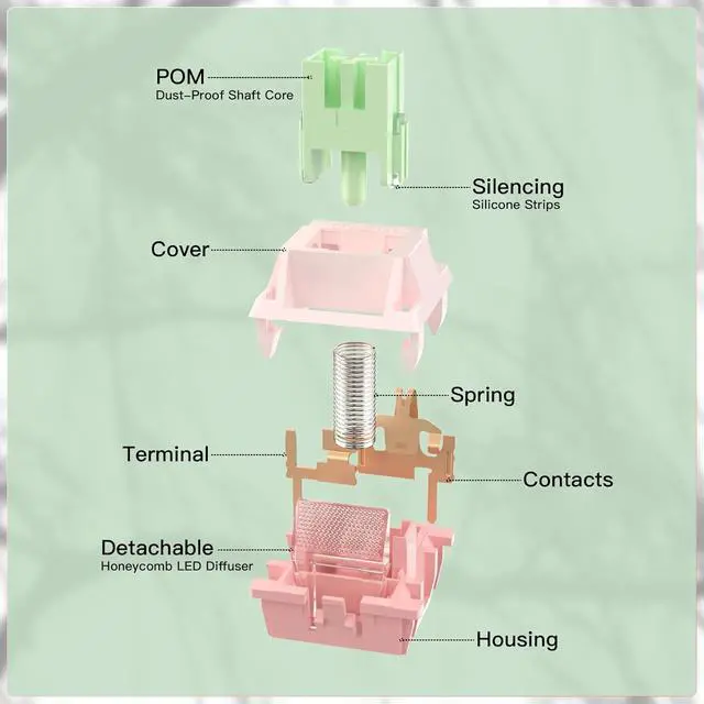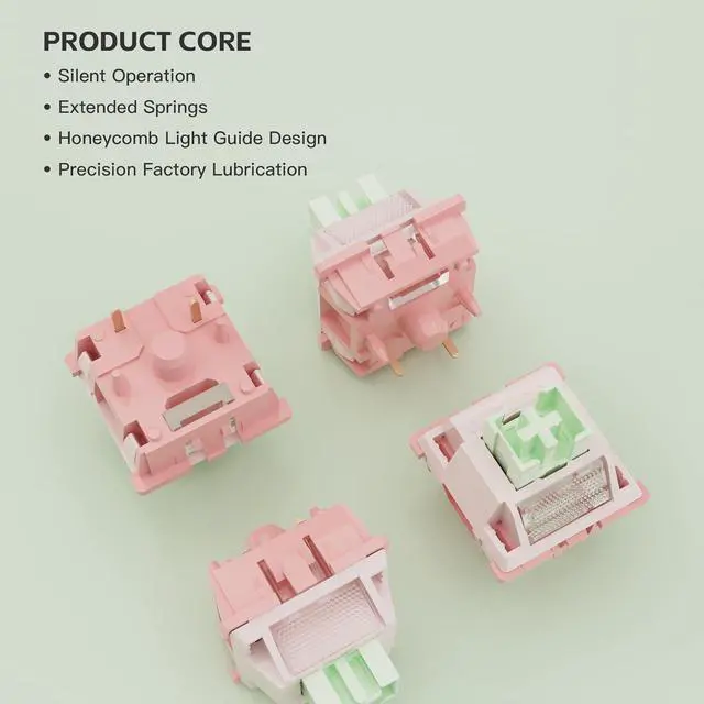 [Premium Materials and Craftsmanship] - Features a POM (polyoxymethylene) dustproof axle core with dual-sided noise reduction design; Nylon glossy polycarbonate top and bottom covers showcase a vibrant peach pink hue; Innovative beveled honeycomb light guide column achieves>95% light transmittance; long-life anti-oxidation moving/static plates paired with modern long springs deliver powerful rebound force.