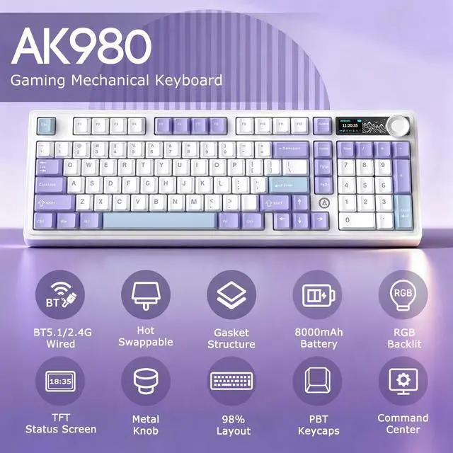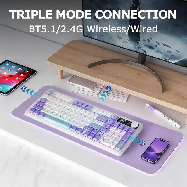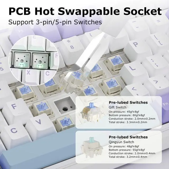 Tri-Mode (BT 5.1 / 2.4G /USB-C) & Fully Hot-Swappable Seamlessly connect up to 3 devices. Hot-swap sockets let you easily install ANY 3-pin/5-pin switches no soldering! Find your perfect feel (sound included! ). Includes smooth Gift Linear switches (45gf) & full N-Key Rollover.