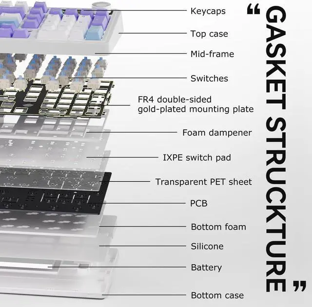 Premium Gasket Mount for Pure Sound & Stable Feel Elevate your typing symphony! The Gasket structure combined with 5-layer precision filling eliminates case ping and stabilizer rattle, delivering a cleaner, more consistent thocky sound profile. Enjoy buttery-smooth keystrokes and unparalleled typing stability with every press.