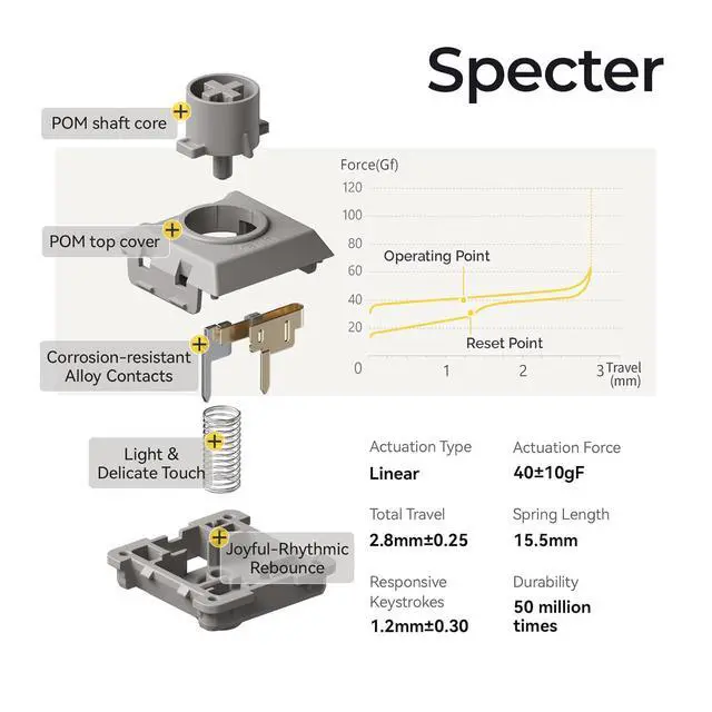 40g Linear Action: Light, consistent linear force. Ideal for quiet, fatigue-free typing/gaming no tactile bump or audible click.