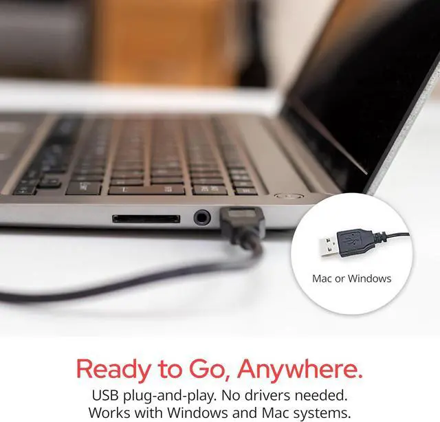 Simple, plug and play USB 2.0 corded connection; Compatible with Windows, MacOS, Chrome OS, Linux Kernel 2.6 and higher
