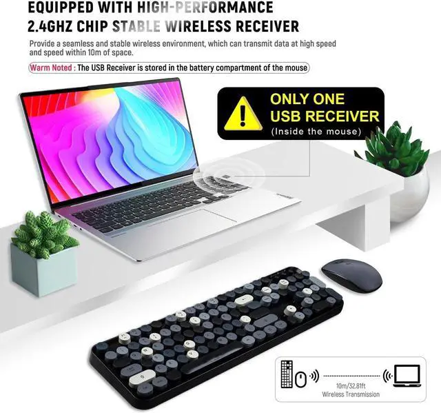 Reliable 2.4GH z Wireless ConnectionEnjoy the freedom of a wireless keyboard and mouse combo with a range of up to 33 feet. A Nano USB receiver (stored inside the mouse) connects both keyboard and mouse instantly. Plug-and-play simplicity with no software or lag issues. The black bubble wireless keyboard and mouse can also be used independently.