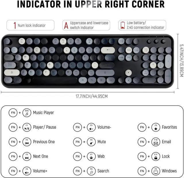 Unique Black & Grey Gradient DesignStand out with our sophisticated multi-color gradient aesthetic. This wireless keyboard features a curated palette of black, dark grey, and cool grey retro round keycaps, creating a vintage yet modern " dark academia" look that elevates any desk setup. Whether youre working or gaming, this combo offers both functionality and fun.