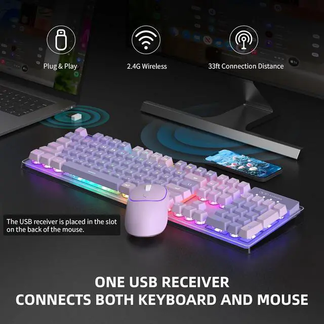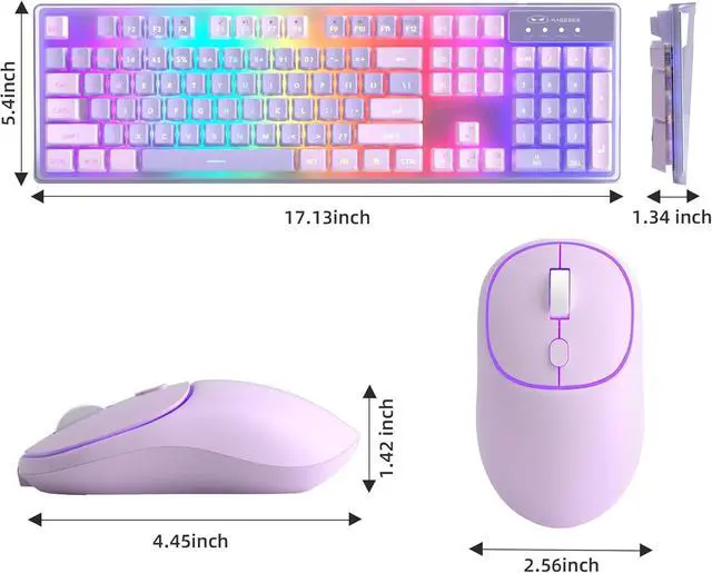 DYNAMIC RGB BACKLIGHT: The led keyboard has lots of different lighting settings - 5 light modes, 7 solid color backlights and 1 rainbow backlight, 3 brightness levels and 4 light speeds. The backlight can be turned off at any time. The keys are shine-through and easy to see in low-light environments. The wireless mouse features a gorgeous RGB light strip that adds vibrancy to the clean look.