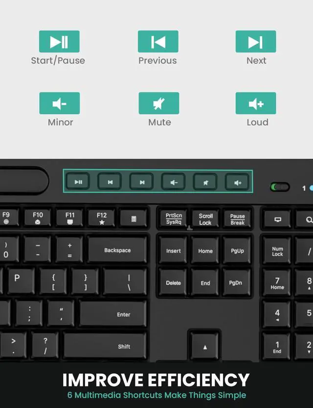 Increase EfficiencyWireless keyboard mouse combination, your phone, tablet, etc. Space for your home. Allows you to view messages or information without having to remove your phone. Includes 6 media keys for quick access to play/pause, volume control and more.