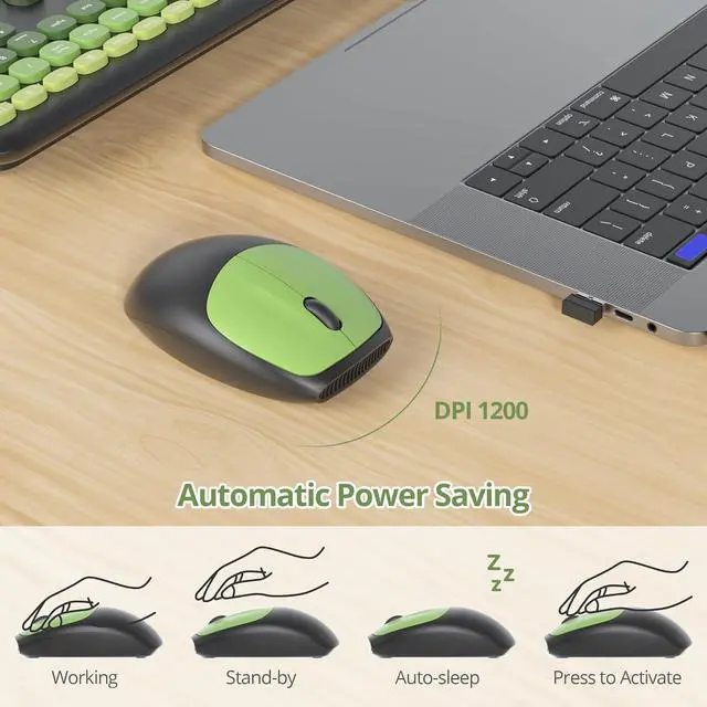 Auto-Sleep Mode: The green wireless keyboard uses 1 AA battery, while the wireless cute mouse also requires 1 AA battery (included). Both devices enter auto-sleep mode after inactivity, optimizing battery usage for extended life